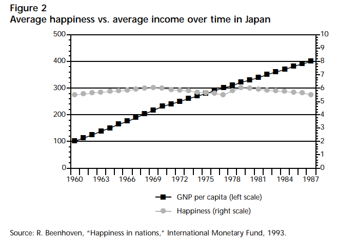 A large body of data from the behavioural science literature links human well-being to relative income. Michael Wolfson mentioned the research linking inequality and health, and there are also studies linking inequality and broader measures of well-being. Behavioral scientists have developed a number of different ways to measure human well-being, and these measures have been used in a large body of research that probes the links between income, wealth and well-being. One basic finding is that once a country passes a relatively low threshold of absolute income, across-the-board increases in income and wealth do not produce measurable increases in happiness. The chart for Japan in Figure 2 below is representative of findings of this type. Income goes up steadily over time, yet the happiness measures just bump along at roughly the same level year after year.