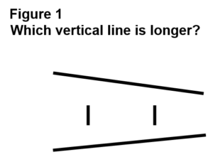 Which of the two vertical lines in Figure 1 below is longer? When we pose this question to people in laboratories all around the world, they insist that the line on the right is longer. Why are they so sure? It’s longer, they say, because it looks longer. And the reason it looks longer is that it bridges a larger share of the gap between the two horizontal lines in the figure.
