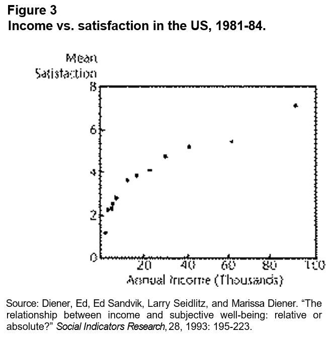Unlike Figure 2, which tracked what happened when everybody’s income went up, Figure 3 tracks what happens when some incomes are different from others at the same time in the same place. People with high incomes are much happier, on the average, than people with low incomes, just as economists always would have imagined. But their happiness seems essentially a consequence of their high relative income rather than their high absolute income. Needless to say, there are plenty of rich people who are unhappy, and plenty of poor people who are happy. Figure 3 merely depicts broad average tendencies. But social policy is always based on averages, and the relationship shown in the figure is compelling.