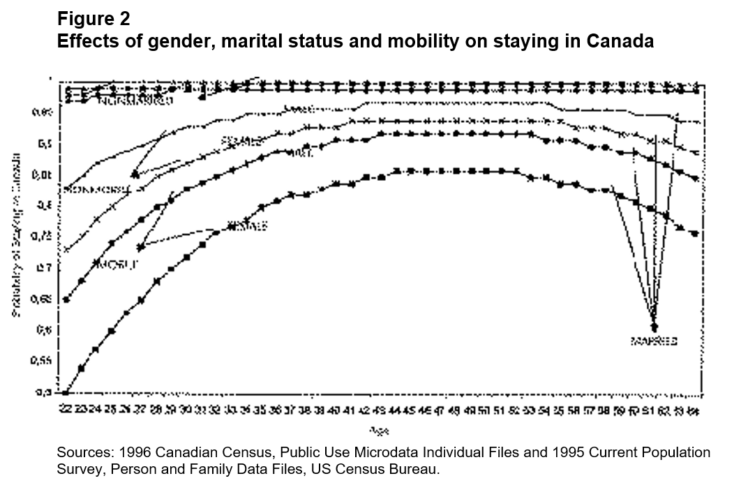 In sum, the probability of staying in Canada depends on the size of the income gain, which varies systematically with age, and on the onset of major lifetime events, which raises or lowers this probability. Both the shape of “the staying function” and the shifts in it that, we argue, different life-cycle events will cause will have important policy implications—if the model holds empirically, that is. We think it does and now proceed to provide the relevant evidence.