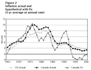 On average over the entire period, maintaining a fixed exchange rate would have resulted in Canadian inflation being lower than it actually was, and lower than US inflation as well, since the downward pressure from adverse commodity prices and a less dynamic economic performance on Canada’s real exchange rate would not have found outlet in a declining nominal exchange rate, but instead would have put persistent additional downward pressure on Canadian prices and costs. Output would almost certainly have been more variable, although this period illustrates the Bank of Canada’s tendency to allow exchange-rate fluctuations to compromise its domestic objectives, somewhat mitigating the contrast. (For several reasons, the Bank of Canada has often responded to movements in the exchange rate with opposite-direction moves in short-term interest rates, resulting in changes in monetary conditions that were unhelpful to inflation control.)