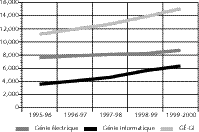 Figure 3 Inscriptions aux cycles supérieurs, GÉ-GI, 1995-96 à 1999-2000
