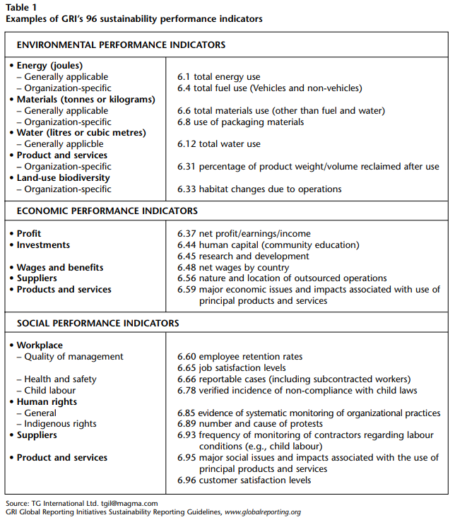 A GRI sustainability report has six parts. It begins with a CEO statement in which the CEO reports on sustainability successes and failures and identifies major challenges for the organization and its business sector in integrating responsibilities for financial performance with the implications of these issues on future business strategy. Next comes a profile of the reporting organization and the scope of the report, then an executive summary with key economic, environmental and social performance indicators. The most demanding GRI section very likely is “vision and strategy,” in which, possibly for the very first time, senior management is asked to set out its vision of the company’s future and discuss how that vision integrates economic, environment and social performance.