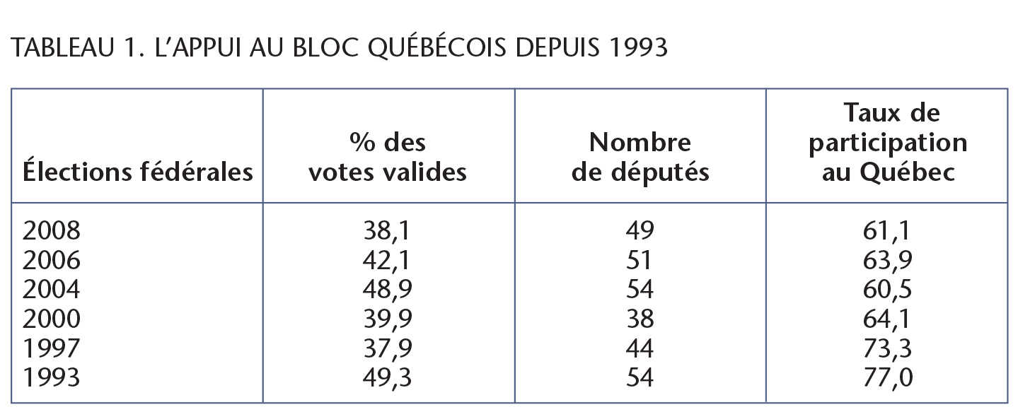 Le Bloc québécois a été créé en 1990 par Lucien Bouchard dans la foulée de l’échec de l’entente Meech-Langevin et du rejet par le Canada des divers principes guidant cet accord. Depuis lors — six élections plus tard — ce parti continue d’obtenir la majorité des sièges au Québec (voir le tableau 1). À chaque élection, la stratégie des partis fédéraux est de mettre en doute la pertinence du Bloc dans l’antre même de la fédération canadienne : la Chambre des communes. Mais il s’agit d’un coup d’épée dans l’eau. Depuis dix ans, les Québécois donnent inlassablement leur confiance au chef le plus expérimenté et qui connaît le mieux l’humeur des Québécois : Gilles Duceppe. Les résultats du dernier scrutin n’ont fait que confirmer cette tendance. La performance du Bloc québécois a surpris bien des observateurs qui avaient déjà enterré le parti souverainiste. Pourtant, celle-ci s’explique assez facilement : les immenses qualités du chef ; un message simple et clair ; un allié inattendu.