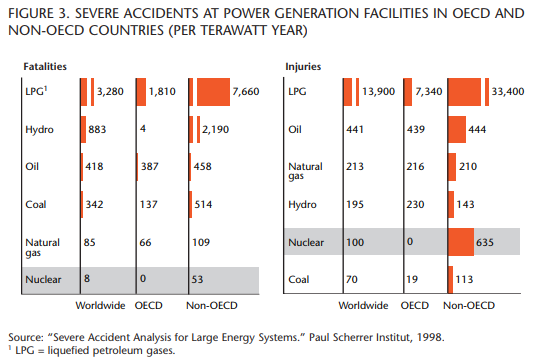 The halting of Ontario’s new reactor build, however, suggests that capital costs may be a challenge. If the industry cannot deliver capital costs in the range of $4,000 per kilowatt, the nuclear renaissance may be short-lived. Furthermore, despite an impressive safety record relative to competing technologies (figure 3), some remain cautious in their consideration of nuclear power, particularly in jurisdictions where it doesn’t already exist. An emerging challenge for new nuclear projects is the recent drop in natural gas prices, spurred by the global economic downturn. If gas prices persist below US$5 per million BTU, as figure 2 shows, nuclear power would have difficulty competing economically with gas — even if carbon pricing significantly increased beyond $30 per tonne. With gas prices low, it will be difficult for jurisdictions to resist the temptation to build more gas-powered electricity generating capacity — the greenhouse gas footprint of gas is better than that of coal, but significantly worse than that of nuclear power (see figure 1).