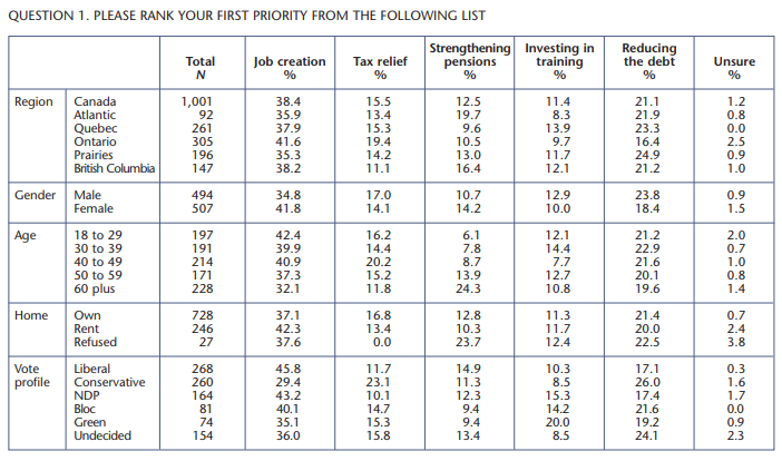Asked to name their second priority, Canadians again chose job creation, debt reduction, tax relief and pensions in the same order as their first priority (table 2).