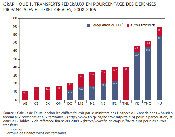 Entre le Québec et le second groupe de cinq provinces, il y a un écart considérable. En effet, le Manitoba dépend des transferts pour financer ses dépenses budgétaires à hauteur de 31,6 p. 100, 10 points de pourcentage de plus que le Québec. Suivent les quatre provinces atlantiques, Terre-Neuve-et-Labrador fermant la marche à 41 p. 100, même si elle ne bénéficie plus de paiements de péréquation. Cet apparent paradoxe terre-neuvien s’explique par les fonds que la province continue de recevoir en vertu de l’entente de 1985 sur les ressources extracôtières. Notons que Terre-Neuve a comptabilisé des transferts particulièrement élevés en 2008-2009. Enfin, les territoires forment le troisième groupe, dont plus de deux tiers du budget sont financés par le gouvernement fédéral.