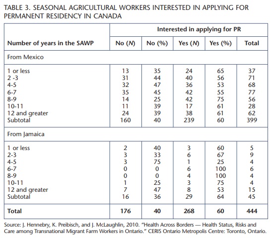 Aside from the LCP, the two-step migration process has largely been a high-skill migration phenomenon, and this trend is likely to persist, given the introduction of the Canadian Experience Class (a program that opens a pathway to permanent residency for foreign students and highly skilled temporary migrants). There are no such pathways to permanent residency in the SAWP and the Low-Skill Pilot Project, despite the fact that many migrants have a long history of participation and are interested in gaining permanent entry (see table 3). In fact, of 444 SAWP migrants from Mexico and Jamaica interviewed in 2008-09, 60 percent indicated they were interested in gaining permanent residency in Canada.