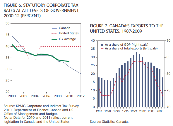 More importantly from the perspective of the continental balance of economic power, the top corporate tax rate was slashed from 28 percent to 21 percent, and the Conservative government continued this trend by cutting it further to 15 percent by 2012. As a result, the total corporate tax burden has gone from worst to first, with the advantage over the United States growing increasingly large.