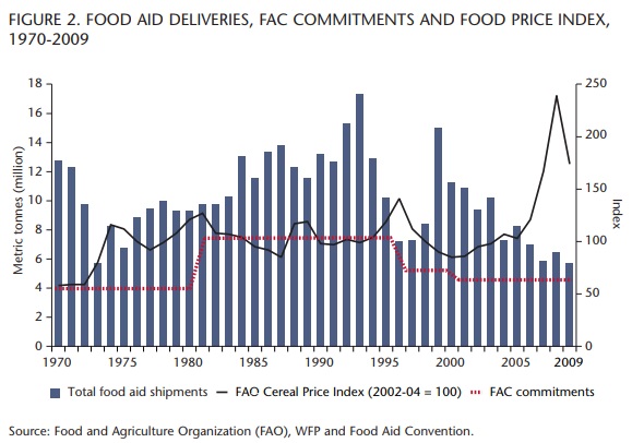 Another aspect of the talks on donor commitments within the FAC is the overall amount provided collectively by donors. At the time of the 1970s food crisis, when prices rose sharply, food aid donations fell dramatically, as they have in recent years. The 1974 World Food Conference made a plea to donors to raise food aid levels to 10 million tonnes per year. The 1980 FAC renegotiation saw a rise to 7.6 million metric tonnes committed — not the full 10 requested, but a significant increase in the base amount to be provided by donors.
