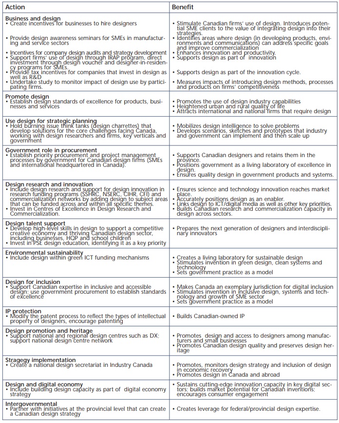 The study concludes that although Canada has the third-largest design service sector in the world, there is no design policy despite the existence of an innovation policy “The innovation strategy recognizes the importance of developing and exploiting new products, but does not comment on the role of design in this process. Indeed there is very little mention of design in the innovation strategy.” They found that businesses in Canada have not received any incentives to include design as part of their research and development strategies. Few companies have reached the point where they utilize design beyond styling or appearance, integrate it into the R&D process or consider design as a key strategic element.