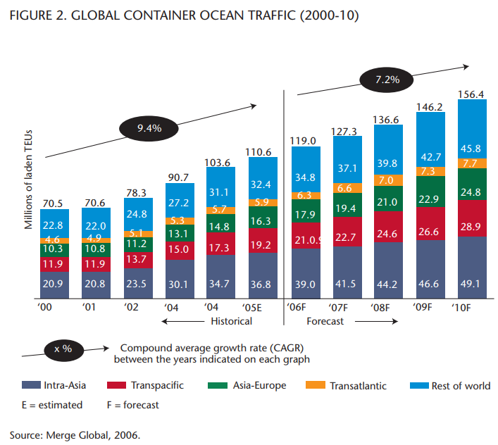 On a global basis, Canada’s constant challenge is to recognize that international trade is based on an ocean-going transportation system. Seaborne traffic covers over 90 percent of international trade. The containerized portion of this passed a milestone in 2004 with 360 million TEU of throughput in the world’s ports. For Canada, the challenge now is to design a national transportation system that is state of the art to deal with the world’s biggest market, the United States, and that reinforces Asia’s role in that competitive market.