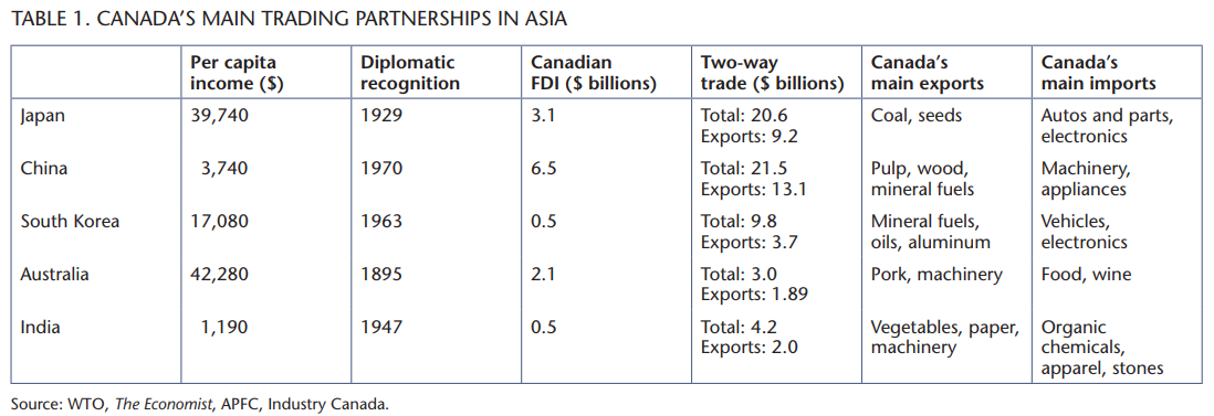 In the past four decades, in part arising from Prime Minister Pierre Trudeau’s 1970 decision to recognize China (in advance of America’s recognition in 1979), Canada has cultivated closer ties with Asia, such as regular ministerial visits, bilateral meetings with heads of state, trade missions, opening of regional consulates beyond the national capitals and more commercial ties between leading business groups and industry associations. In reality, however, the trend of Canadian trade and investment bilateral relations is friendly but sporadic, successful but hardly overwhelming (table 1). Each Asian country has its own domestic problems to sort out, starting with protectionist forces in agriculture and highly protected national champion sectors.