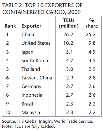 For over 30 years, Canadian policy-makers have been concerned with the country’s gateway strategies — transportation links via air, oceans, Great Lakes and rail — that shape Canada’s exports and imports flows. Initially, Japan’s import needs were one of the first priorities, as that country’s dramatic growth led to an apparently insatiable demand for Canadian raw materials — timber, coal, grains, pulp and paper — and an equally dramatic rise of Japanese exports like automobiles and consumer electronics. Container flows were two ways. As Pacific Rim trade with North America grew, West Coastports—Los Angeles and Long Beach, Seattle and Vancouver — have faced increasing port congestion, as the flow of containers across the Pacific skyrocketed, from 2 million TEUs in 1970 to 20 million TEUs in 2009 (table 2). (A TEU is a transport term meaning a 20-foot equivalent unit. Most containers in North America are 40 feet, some are 53 feet.)