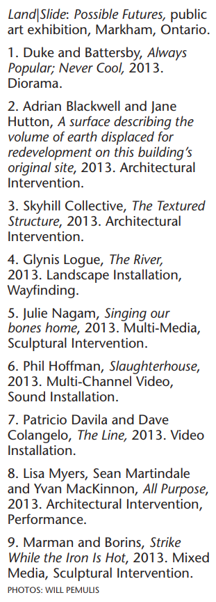 Among the many Land|Slide projects, three examples show how the installations created important conversations centred on Markham’s planning framework: