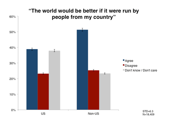 Now, new data-capture technology has given us a chance to fill in those blanks. By enabling us to reach broadly and deeply across countries in search of answers to a question, the technology has enabled us to obtain new multicountry data that stand these perceptions on end. In this case, we posed one prompt to more than 18,000 English-speakers from around the world: ”œThe world would be better if it were run by people from my country.”