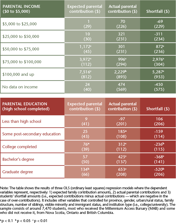 Parental income is much less sharply related to actual parental contributions, and here parental education is found to play a significant role. The net effect is that higher parental incomes are strongly associated with shortfalls in parental contributions, while higher parental education is associated with students receiving more financial support from their parents than is expected by student financial aid systems.
