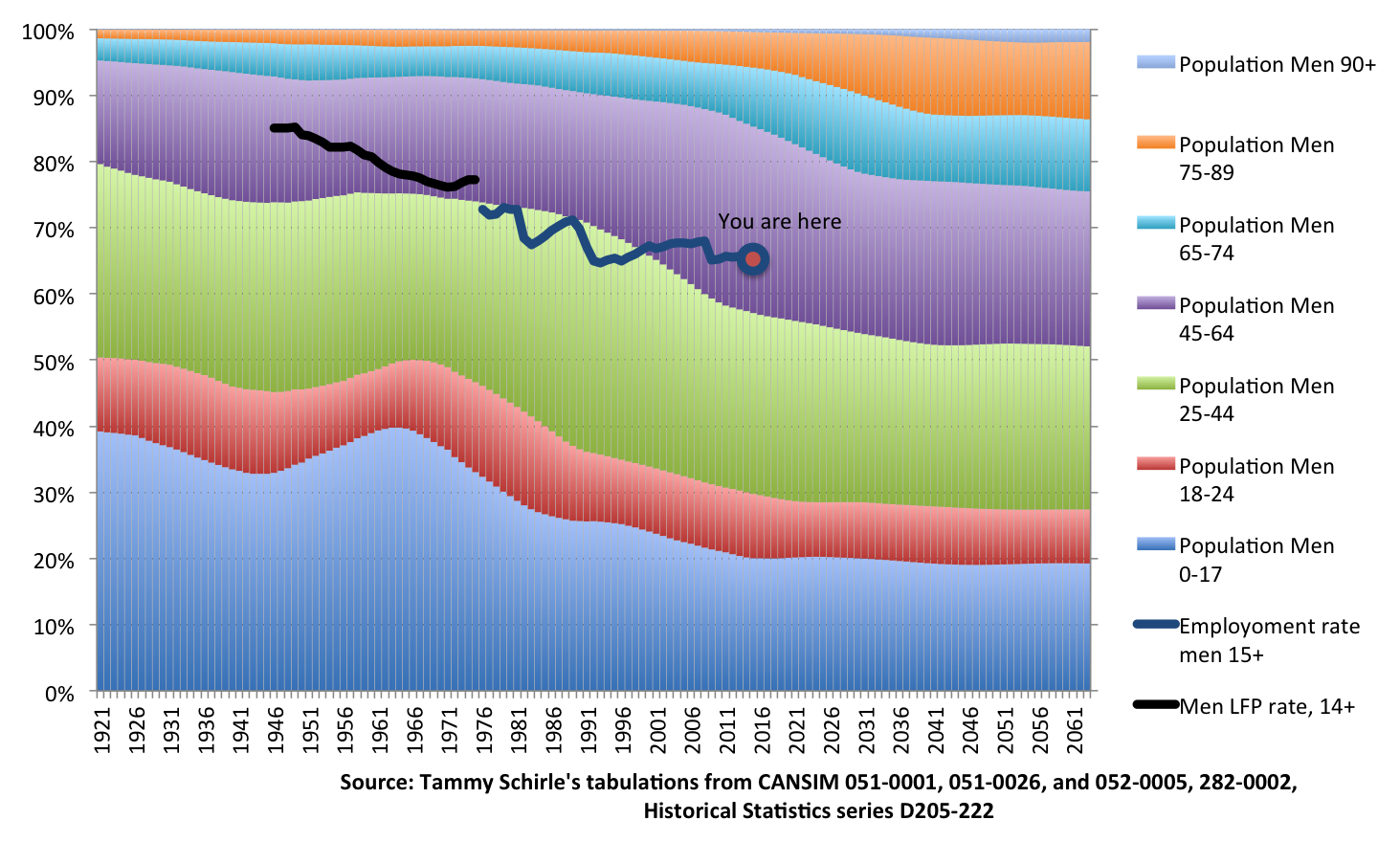 On top of that, I put men’s labour force participation rates from 1946-1975 and employment rates since 1976. Those have steadily declined. You can imagine projecting forward income tax revenues against major health expenditures…. Looks like we’re toast.