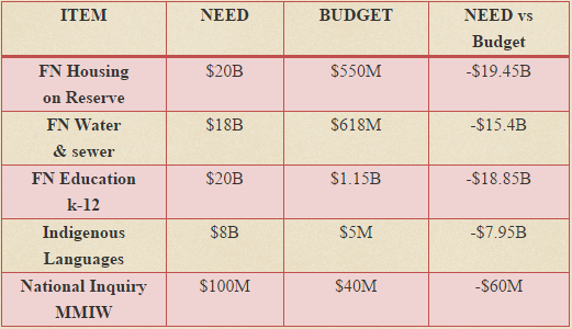 Even the amount set aside for a national inquiry into murdered and missing Indigenous women and girls pales in comparison to the costs of past inquiries. But we also have to realize that not all of the $5.3 billion is even going to go to First Nations. A large percentage is set to go to INAC, DFO, CMHC, NEB*, various political organizations and even former Liberal Prime Minister Paul Martin. So once again, the bureaucracy will benefit first. Also, due to the length of this blog, it couldn’t include any analysis of the funding deficiencies for Indigenous peoples living off-reserve or the Inuit in the north – which would only compound the grossly under-funded budget presented. There are just too many budget items to go through in the space of one blog. However, there are some glaring omissions that have to be highlighted.