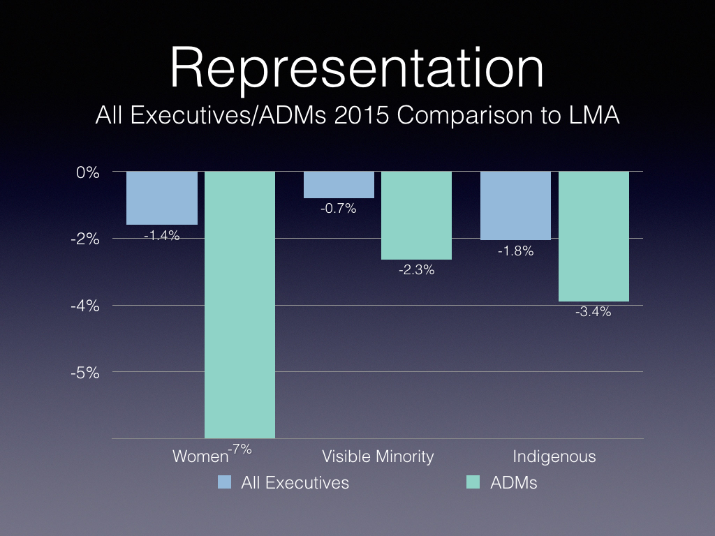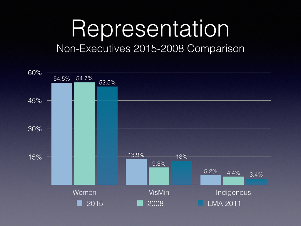 Women’s executive representation has increased by 11 percent, visible minority representation by 31 percent, but that of Indigenous peoples has remained flat.