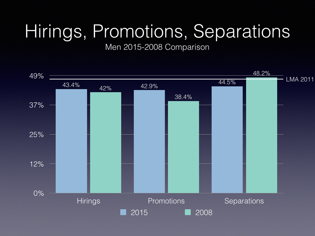 Chart 6 contrasts 2015 with 2008 data. We see that women are over-represented compared to their 2011 Labour Market Availability in hirings, promotions and separations. In other words, the rate of increase in women’s representation has not yet plateaued.