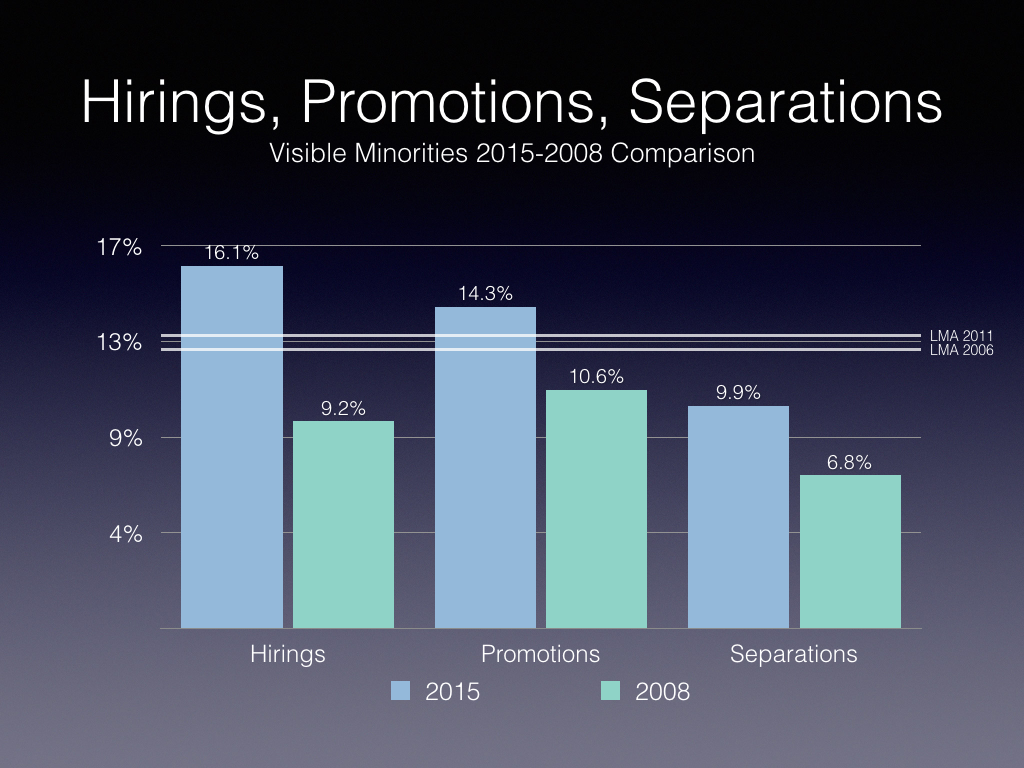Contrasting hirings and separations, women are being hired slightly more than they are leaving (1.1 percent), visible minorities are being hired significantly more (6.2 percent) and Indigenous people being hired in smaller numbers than separations (1.3 percent).