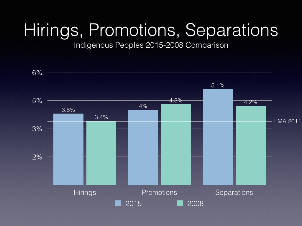 With only 3.8 percent hirings of Indigenous people compared to 5.1 percent separations, this could portend a decline in representation.