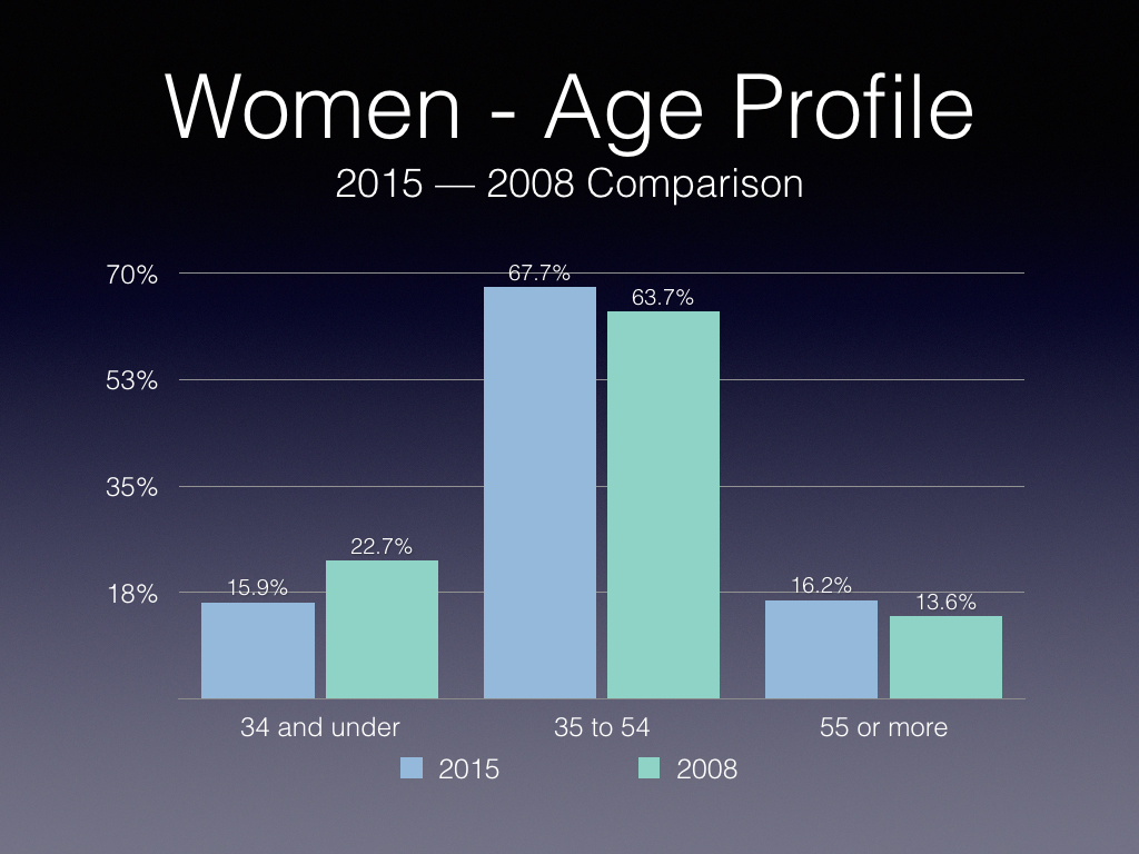 For comparison purposes, we have included data for men, showing a relative shift towards more women executives in the past seven years.