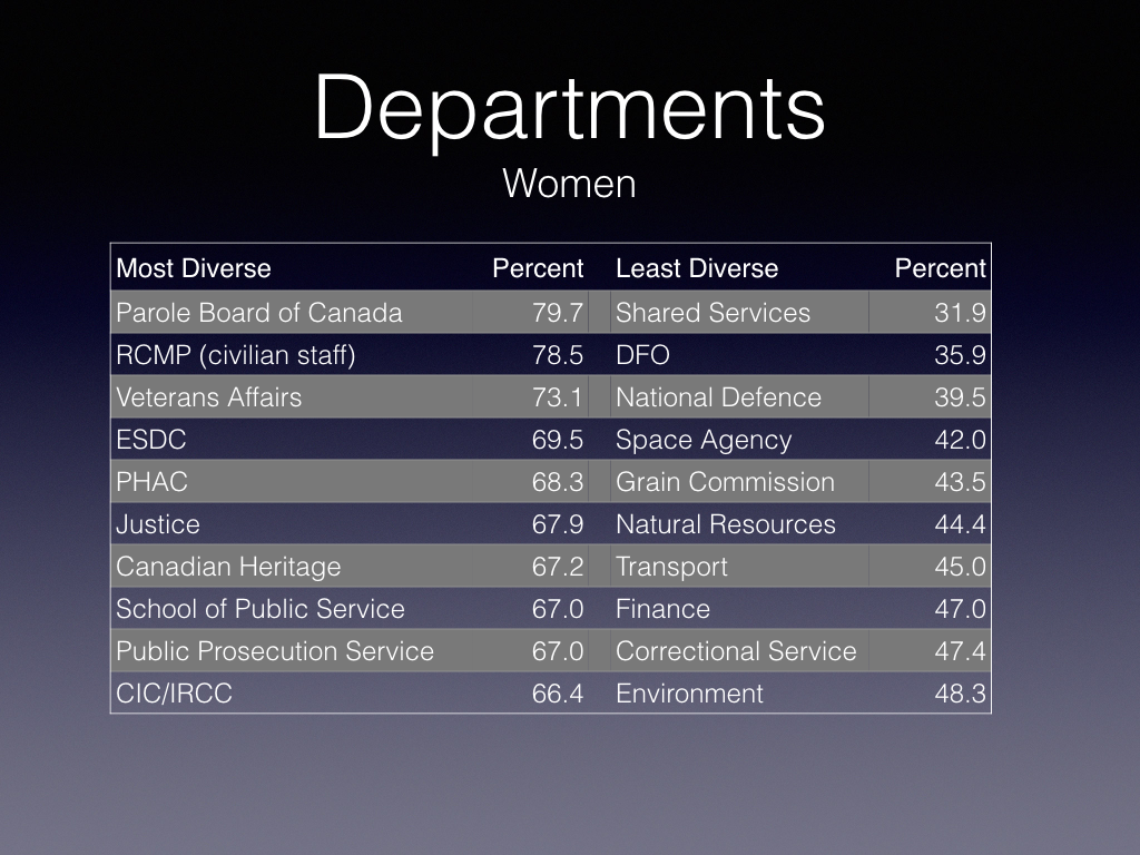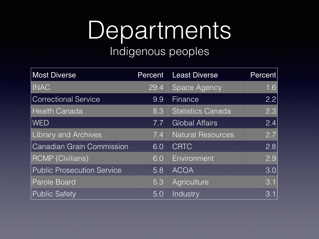 The latest Treasury Board (TBS) report, Employment Equity in the Public Service of Canada 2014-15, provides useful information regarding the relative representation of employment equity groups: women, Indigenous peoples, visible minorities and persons with disabilities. Overall, the public service is reasonably diverse for the three groups which are the subject of this article — women, visible minorities and Indigenous peoples.
