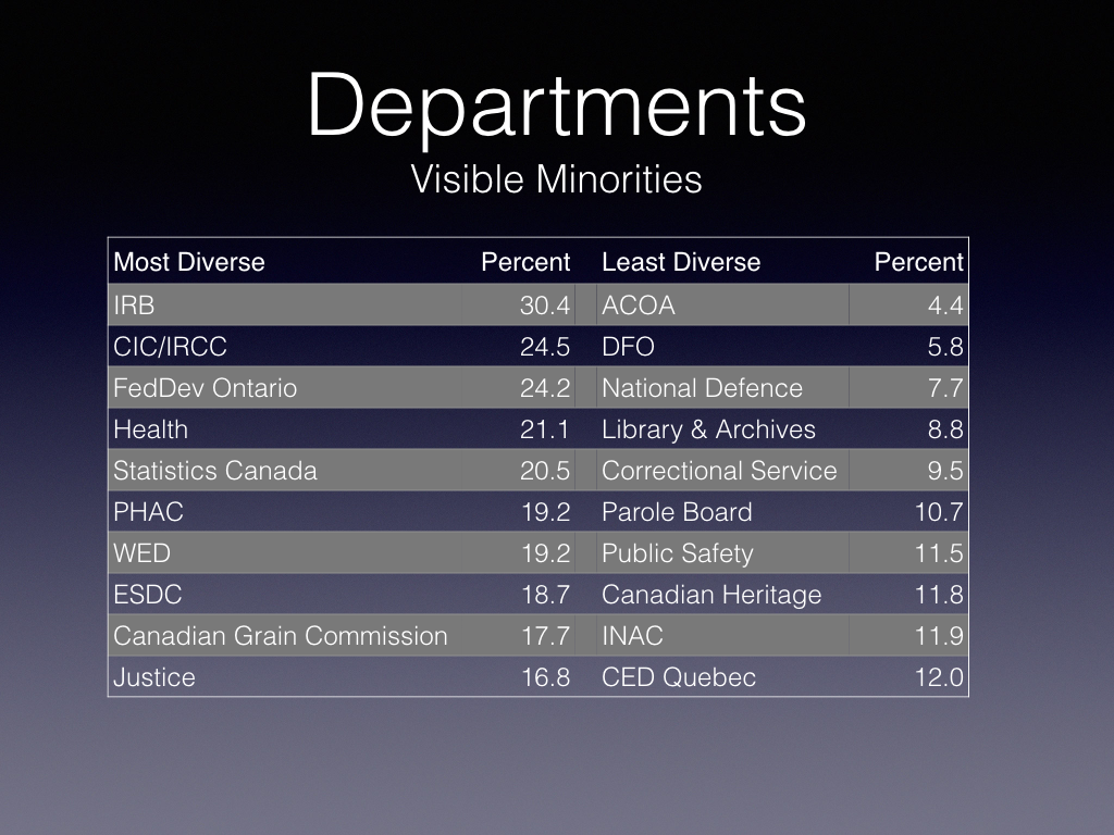 The following Tables 1, 2 and 3 look at the most and least diverse departments, including only those organizations with 250 employees or more, except the Administrative Tribunal Support Service of Canada.