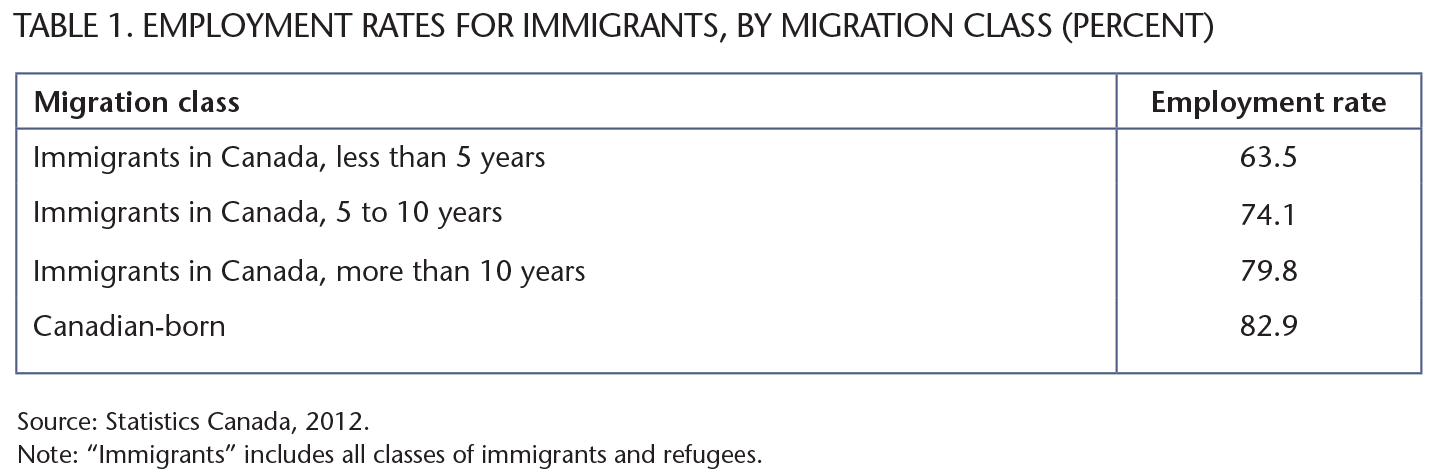 Securing employment is considered a key marker of integration success. However, as shown in table 1, data from the Canadian Labour Force Survey reveal that both immigrants and refugees report higher rates of unemployment relative to their Canadian-born peers, even among established immigrants residing in Canada for more than 10 years; in addition, women face even greater challenges entering the workforce than men.