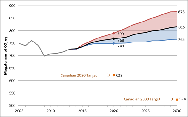 Canada is not currently on a path to meet this target. The latest inventory report from Environment Canada (see the figure below) shows just how far off we are.