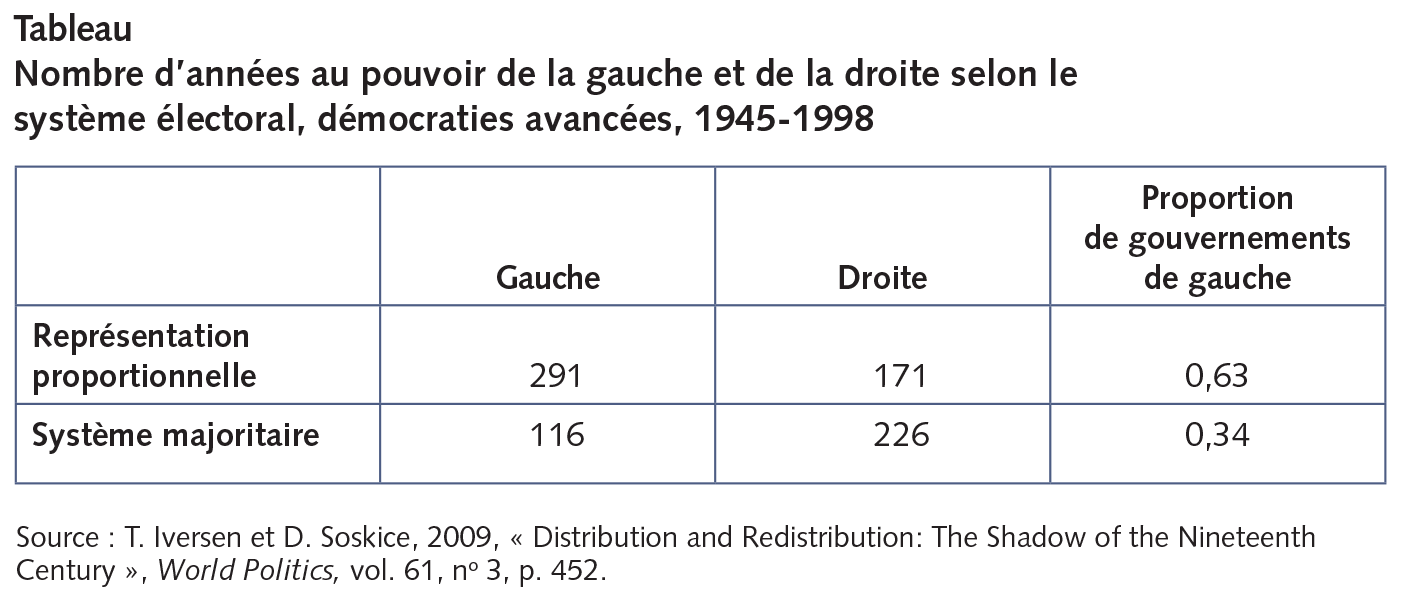 La mise en place de coalitions est parfois longue et difficile, et elle donne lieu à des tractations plus ou moins transparentes, qui ne comportent pas que des avantages. Mais dans l’ensemble, l’exercice a tendance à favoriser les consensus et, ultimement, une plus grande justice sociale. Les démocraties consensuelles redistribuent en effet mieux le revenu que les démocraties majoritaires. Ce résultat s’explique en partie par la nécessité de maintenir de larges coalitions de partis et d’électeurs, et en partie par la présence plus fréquente de la gauche au pouvoir. Le tableau ci-dessous, repris d’une étude de Torben Iversen et David Soskice parue en 2009, compare la force de la gauche et de la droite dans les démocraties avancées, selon le type de système électoral.
