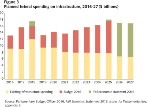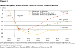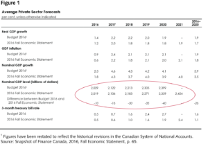 The red circle in the example below (figure 1), taken from the 2016 Fall Economic Statement, shows that the level of nominal GDP was expected to be $40 billion lower towards the end of the budget projection in 2020. That one line tells you that the economic outlook has worsened. This means that the government will probably have less fiscal room. It may decide to scale back its spending plans to keep to its deficit target; it could stay the course and accept a larger deficit; or it could ramp things up and try to give the economy a boost.