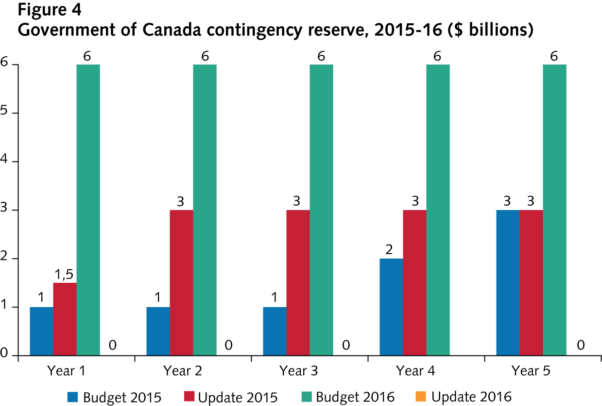 It can be tricky to compare quickly across budgets. You need to make some careful adjustments to avoid misinterpretations, because most budgets include “forecast prudence” (also known as a risk adjustment factor or contingency reserve), and these amounts usually vary from budget to budget (see figure 4). Changes in the government’s bottom line can be due to three factors: (1) economic changes, (2) new fiscal measures, and (3) changing amounts set aside for budget risks. (For details, see an analysis of Budget 2016 here).