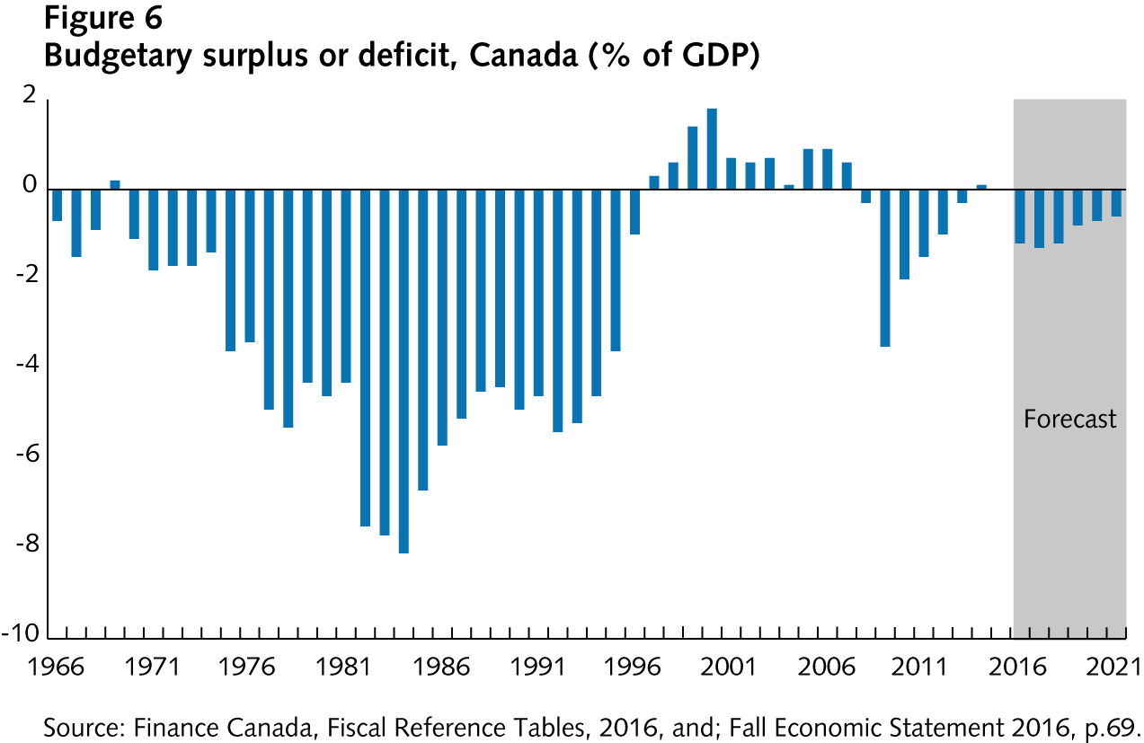 Try not to get caught up in the minutiae of small year-to-year changes; rather, keep a long-term perspective. Try to compare recent results or projections by looking back over history (figure 6). Some changes or new programs may sound important fiscally, but are they really? As an example, several budget pundits got worked up about the fact that Budget 2016 did not spell out a date to eliminate the deficit. However, if we consider these expected deficits not just in nominal terms but also in relation to the size of the economy, it becomes clearer that the fiscal sky isn’t falling. Yes, Canada lived through fiscal crises in the 1990s, but current circumstances are not in the same league, and taking the long view counteracts the urge to be overly dramatic.