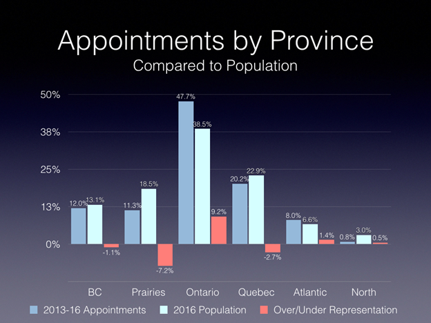 Chart 1 compares the appointments by province to the 2016 provincial population, showing under-representation of seven percent in the Prairies and over-representation of nine percent in Ontario. Quebec is also under-represented by almost three percent, British Columbia by one percent, and Atlantic Canada slightly over-represented by more than one percent.