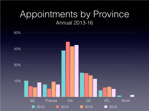Chart 2 looks at how the regional balance has shifted during the four years in question. Western representation was particularly low in 2014 just as Ontario was particularly high, particularly in the December tranche of appointments: 5.3 percent compared to the 2013 Prairie share of the population of 18.1 percent, 56.8 percent compared to Ontario’s share of the population of 38.6 percent. It is likely that these numbers contributed to the Budget 2015 funding decision.