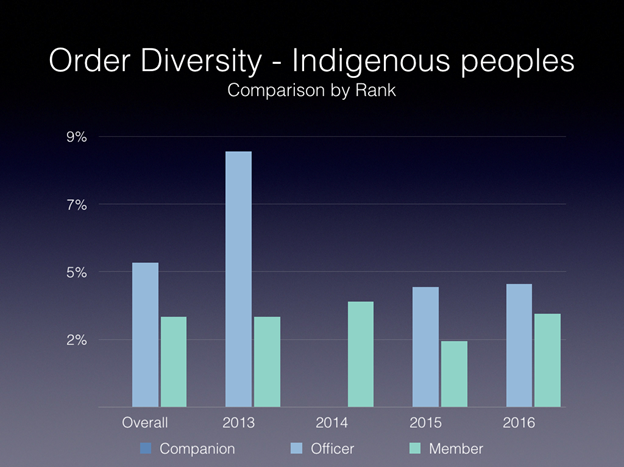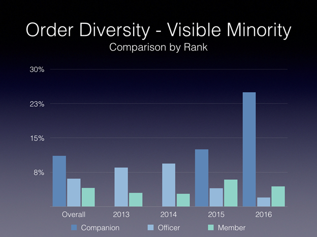 In traditional employment analysis, one looks at levels (or rank in Order of Canada terms) and representation, expecting to see greater representation of under-represented groups at more junior levels than the senior ones. Given the nature of the Order of Canada, this general trend does not appear among the companions, the highest Order of Canada, likely again reflecting a conscious effort to ensure all groups are represented at that level. Women form 44.4 of Companions, visible minorities form 11.1 percent. There were no Indigenous Companion appointments during this period.