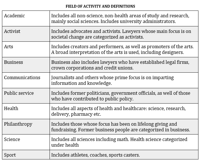 The following table has the definitions I used for the background of recipients. As with any categorization, especially for a group as accomplished as Order of Canada recipients, judgement calls were made with respect to which category was most appropriate, as noted in the definitions.