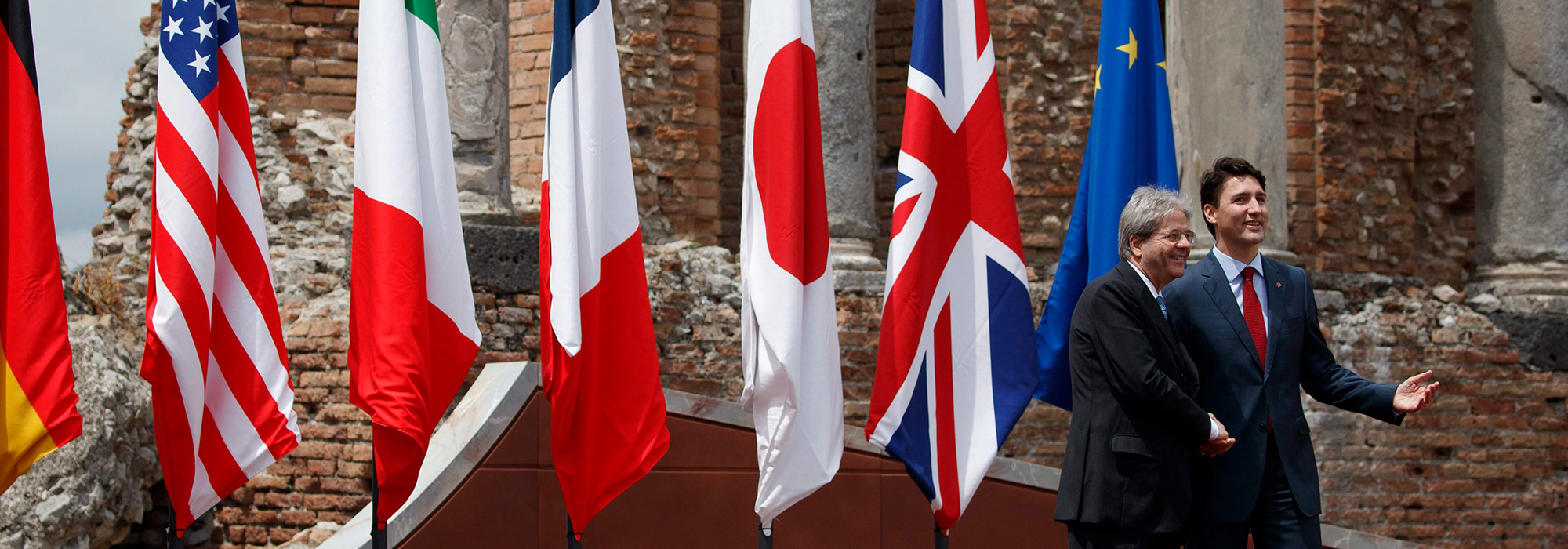 Photo: Italian Prime Minister Paolo Gentiloni greets Canadian Prime Minister Justin Trudeau before a G7 leaders family photo. (AP Photo/Evan Vucci)