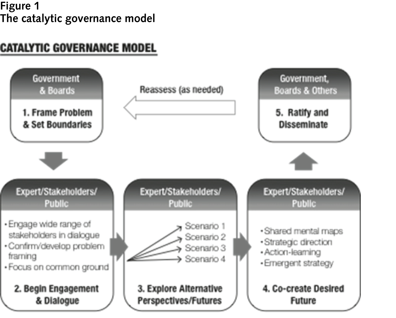 The catalytic governance model represents the type of inclusive and continuing process needed to address such intractable challenges. The model has five steps, summarized in figure 1.