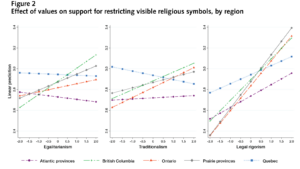 As indicated by the relatively flat slopes in the left panel of Figure 2, egalitarian values do not appear to shape public opinion on religious dress as much as one might expect. This finding probably reflects the tension that exists between egalitarian predispositions toward framing this issue as one of gender equality on the one hand, or of protecting minority rights, on the other. Meanwhile, we find that a greater predisposition toward legal rigorist values is associated with greater support for restricting religious symbols across all regions. In fact, the strongest support for restricting religious symbols is not found in Quebec, but rather among legal rigorists living on the Prairies, and to a lesser extent, in Ontario and British Columbia.