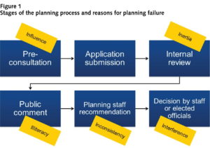 Finally, interference by elected officials in planning processes can derail good planning outcomes. Decision-makers may attempt to alter planning advice, particularly if stakeholders are strongly opposed. Two forms of interference may occur. The first is legitimate: the rejection of planning advice at committees or at council. Municipal councils are entrusted to make decisions on behalf of their constituents and have every right to reject planning advice. But addressing influence and illiteracy can reduce the likelihood of planning recommendations being overturned by elected officials.