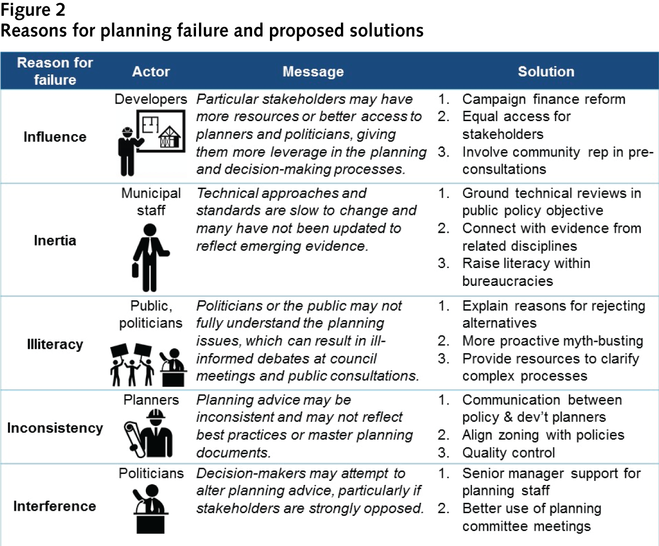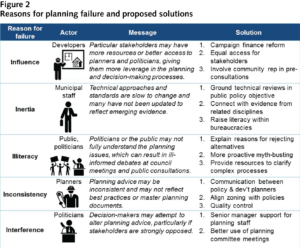 Acknowledging these five major causes of planning failure — influence, inertia, illiteracy, inconsistency and interference — is an essential step toward achieving sustainable growth and better planning outcomes. While it is always tempting — and more fun — to focus on planning success, meaningful dialogue on the reasons for planning failure will enable the identification of potential solutions and strategies to improve planning processes. Cooperation from all actors is necessary to overcoming these five challenges; however, elected officials need to play a leading role to ensure public trust and city building that maximizes the value and benefits of professional planning.