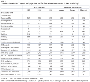 In their first four data columns, tables 1 and 2 show the ECCC oil and natural gas amounts, respectively, while table 3 shows the ECCC numbers for GHG emissions. ECCC’s 2030 projections already assume substantial energy efficiency improvements and fuel shifting from 2014 to 2030: