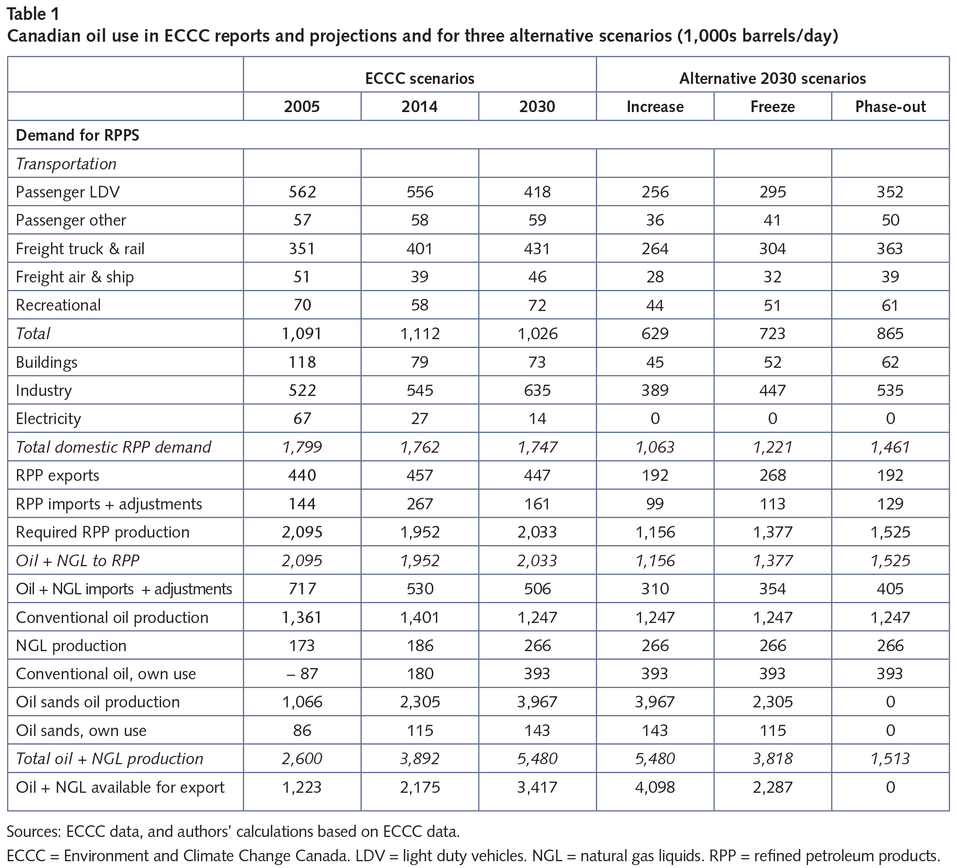Under the Phase-out scenario, in which domestic oil demand is reduced by 16 percent below the ECCC projection, the supply of conventional oil and natural gas liquids would be sufficient to meet the domestic demand for refined petroleum products of 1.41 million barrels/day plus net RPP exports of 200,000 barrels/day, but with no net import or export of crude oil (see table 1). Thus, Canada could be self-sufficient in oil (in fact, have a small surplus) while phasing out its carbon-intensive oil sands oil production and honouring its climate change commitment.