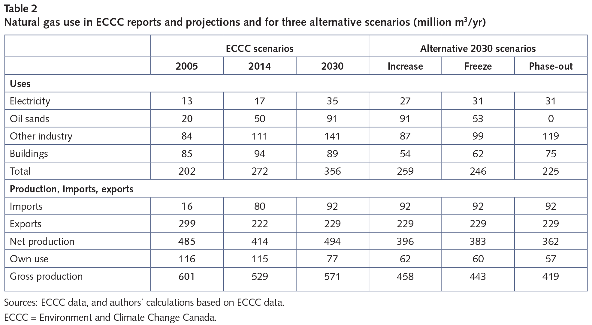 In the Phase-out scenario, gross natural gas production falls from 571 million cubic metres/day (Mm3/day) in the 2030 ECCC scenario to 387 Mm3/day — a reduction of 184 Mm3/day, half of which (91 Mm3/day) is from the elimination of natural gas use for oil sands operations (see table 2). Net exports decrease slightly (from 137 Mm3/day to 112 Mm3/day), although liquefied natural gas production and export of 71 Mm3/day are completely eliminated. These reductions in natural gas production contribute more to GHG emissions reduction than the additional reductions (relative to the ECCC 2030 baseline) from the entire buildings sector (see table 3).