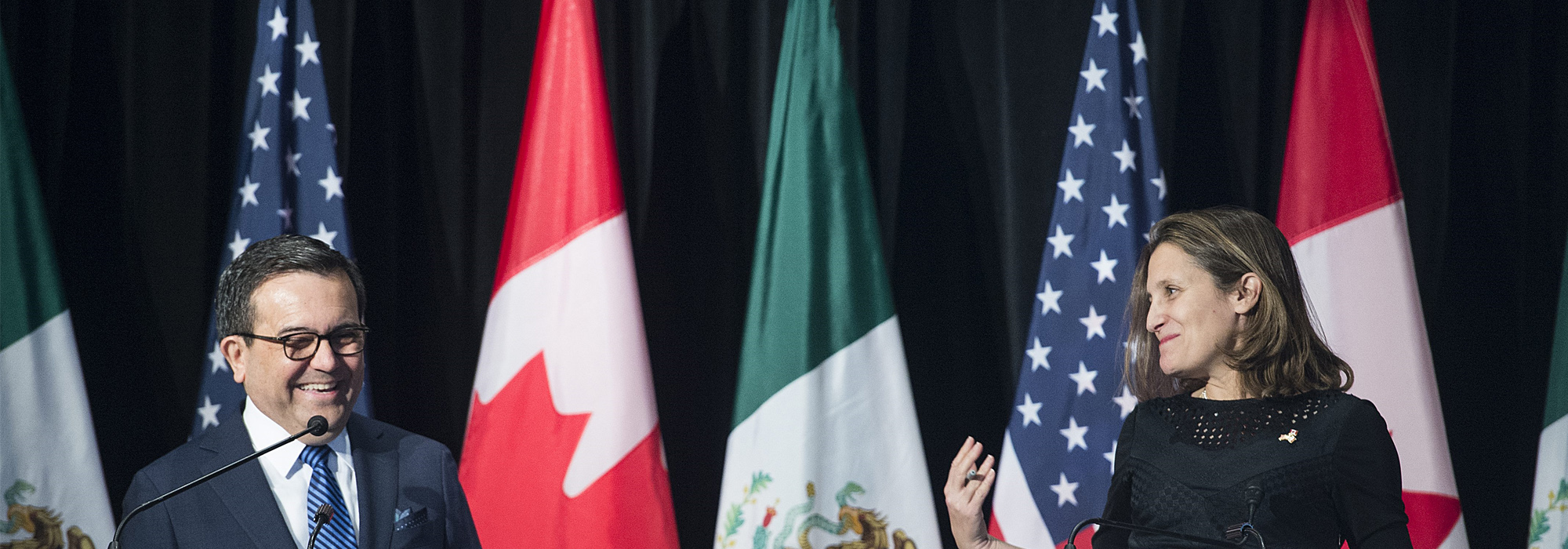 Photo: Foreign Affairs Minister Chrystia Freeland and Mexico’s Secretary of Economy Ildefonso Guajardo Villarrea prepare to deliver their statements to the media duirng the sixth round of negotiations for a new North American Free Trade Agreement in Montreal on January 29, 2018. THE CANADIAN PRESS IMAGES/Graham Hughes.