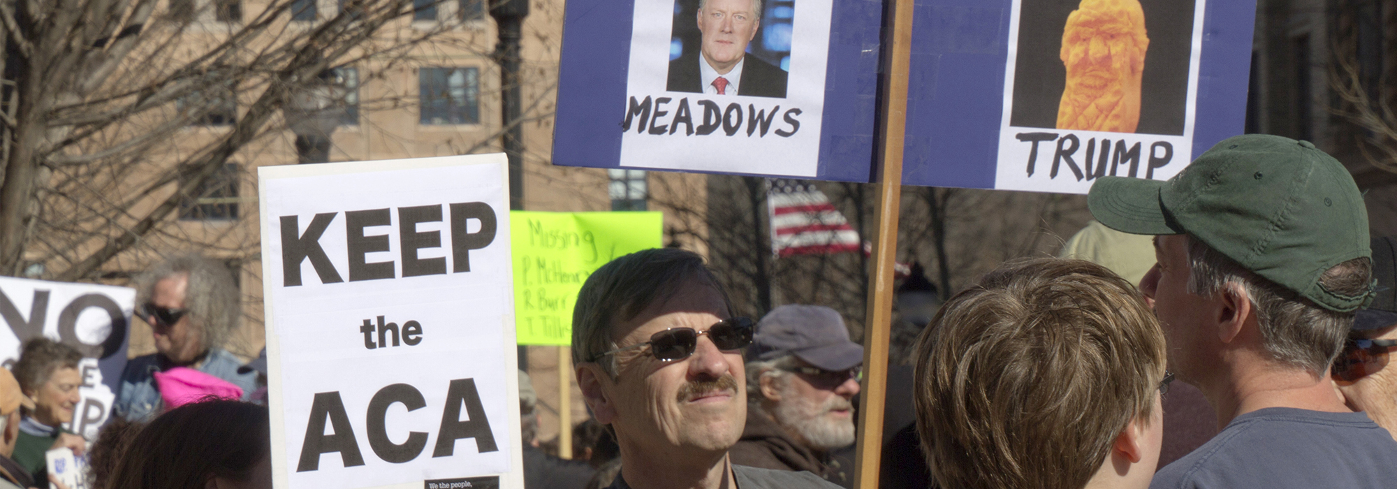 Photo: Asheville, North Carolina – February 2017: Obamacare activists hold signs saying Republicans Mark Meadows, Paul Ryan, Mitch McConnell and President Trump are the real ACA Death Panel. Shutterstock, By J. Bicking.